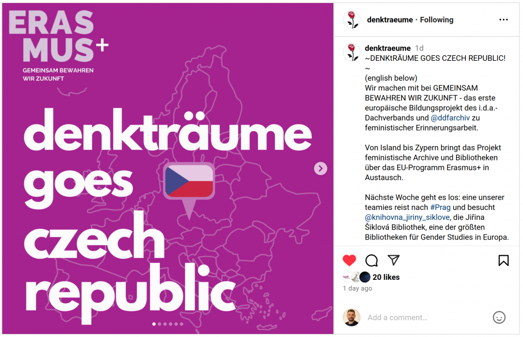 In autumn of 2024, Erasmus+ brought together a traveller from DENKtRäume, Germany and the Jiřina Šiklová Library in Prague, Czech Republic, to explore collaborative opportunities and share expertise Both organizations share a common dedication to preserving and researching the histories of women and minority communities. .
